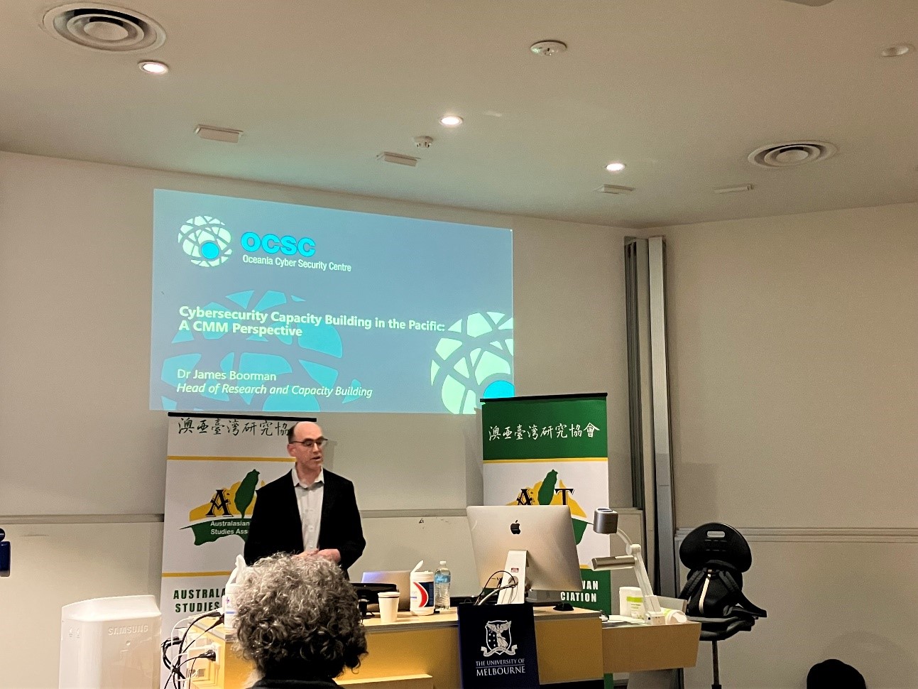 翌日活動則進行第二場次專題演講,由大洋洲網路安全中心資安能力建構處處長 James Boorman博士主講,講題為《Cybersecurity Capacity Building in the Pacific: A CMM Perspective》,就CMM澳方實務推動經驗進行闡述。專題演講之餘亦穿插多場座談,邀得臺澳雙方二十餘位學人擔任講者及與談人,與會者互動熱烈;會中並適時向與會人員宣達本會各項補助高階科研人才發展相關措施,研討會在澳亞臺灣研究協會支持下,整體活動圓滿成功。