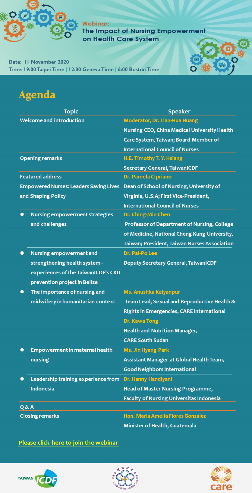 The International Cooperation and Development Fund (Taiwan ICDF), Taiwan Nurses Association, and CARE International will co-host a webinar on “The Impact of Nursing Empowerment on Health Care System” at 6:00 a.m. (EST) on November 11, 2020. Attached please find the agenda for your reference.