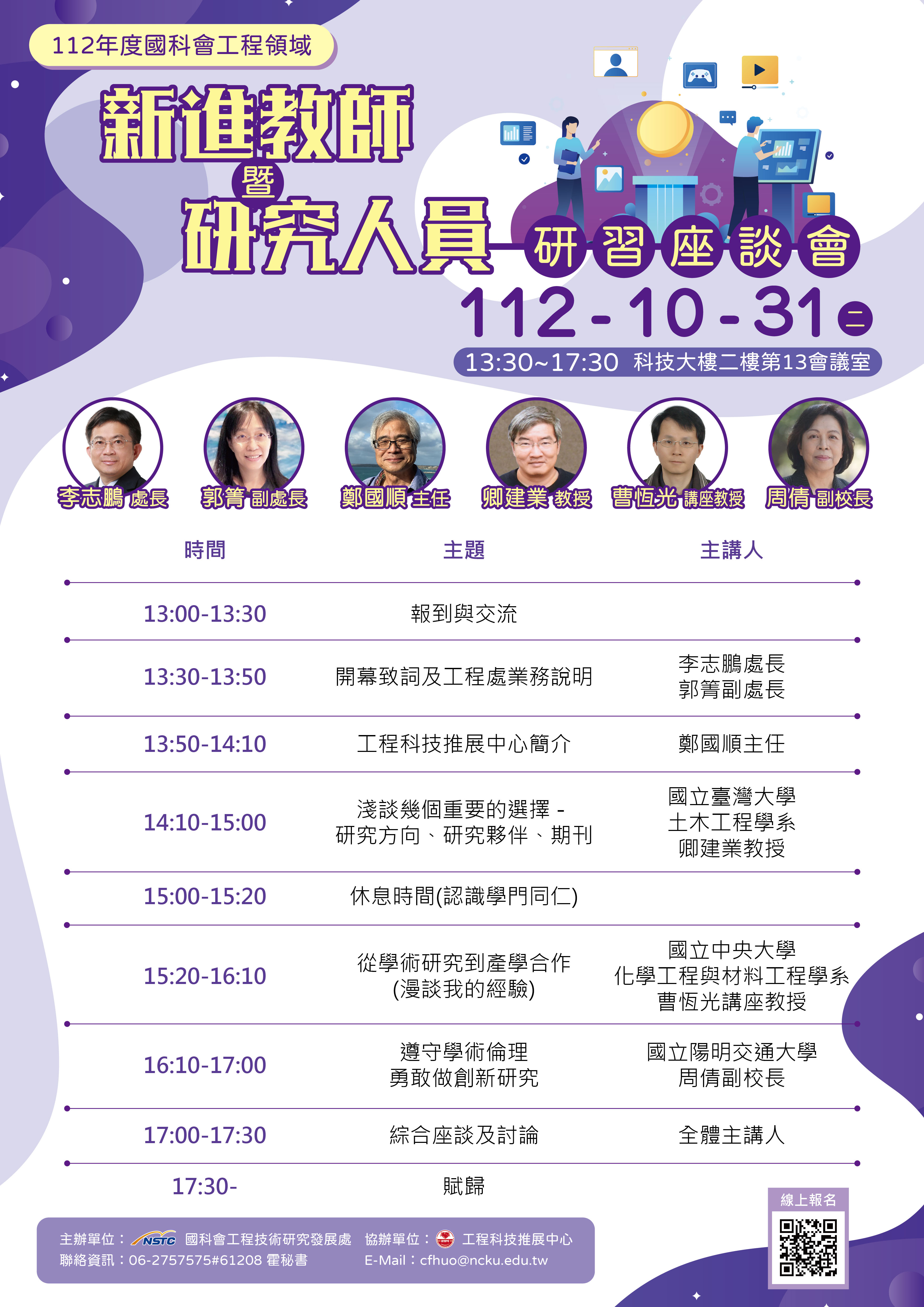 為提供工程領域年輕學者一個學習成長的機會,工程處將於112年10月31日(二)舉辦「工程領域新進教師暨研究人員研習座談會」,本處邀請了專家學者到場分享其教學、學術研究、產學合作經驗及學術誠信等議題;藉由經驗傳承與交流,引領新進學者以更多元的視野展開學術研究生涯。(將核發學術倫理認證2小時證明)