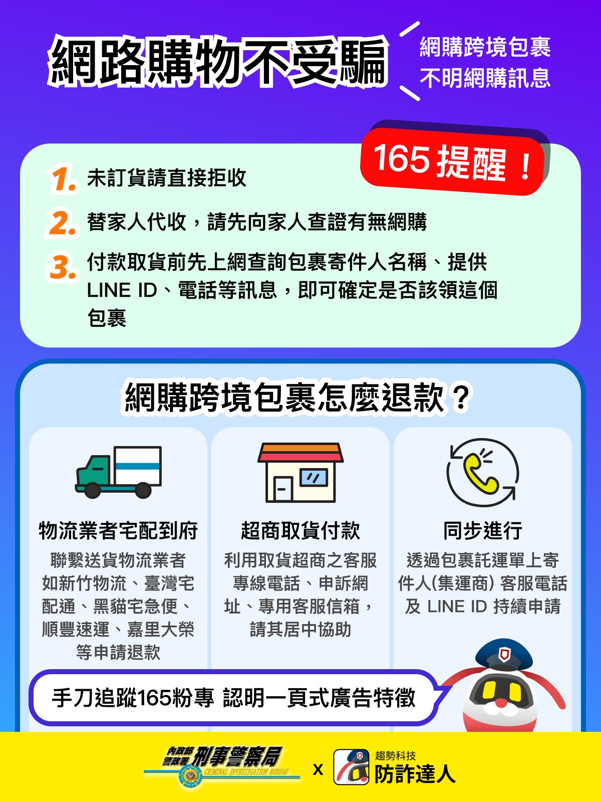 - 近年網購詐騙案件層出不窮,尤其以「超商包裹詐騙」手法最為猖獗,而「超商包裹詐騙」源頭多因民眾點擊「一頁式詐騙廣告」而下單遭詐,經刑事警察局追查「一頁式詐騙廣告」費用資金來源,為我國多家物流及倉儲公司所投放,遂與臺北市政府警察局成立專案小組,並報請臺灣桃園地方檢察署呂股王檢察官念珩指揮偵辦。