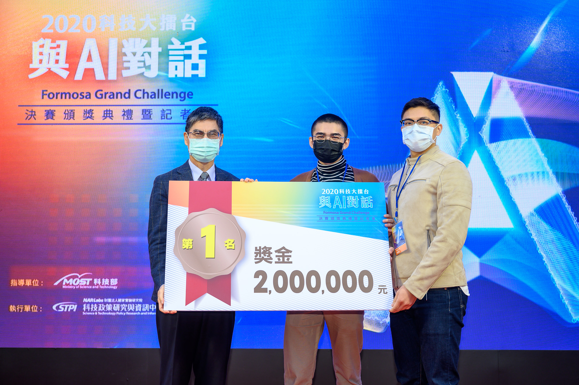 科技部主辦、國家實驗研究院科技政策研究與資訊中心執行的2020「科技大擂台 與AI對話」競賽,今(24)日在臺北孔廟舉辦決賽頒獎典禮。本次決賽AI答題結果仍未達人類答題成績水平,首獎新台幣2,000萬元從缺。成績前3名分別獲得200萬元、50萬元及30萬元獎金:第1名由「Taipei 101」團隊獲得優勝;「大叔與AI對話」及「A Team」團隊分別為第2、3名。另這次重點考題「多輪對話」對談試題中,「中研問答」團隊以完成14輪對話(總共20輪對談,人類答題可完成18輪,其餘隊伍完成4至8輪對話)的優異成績,獲得評審委員會一致推薦額外獲頒10萬元鼓勵獎金。