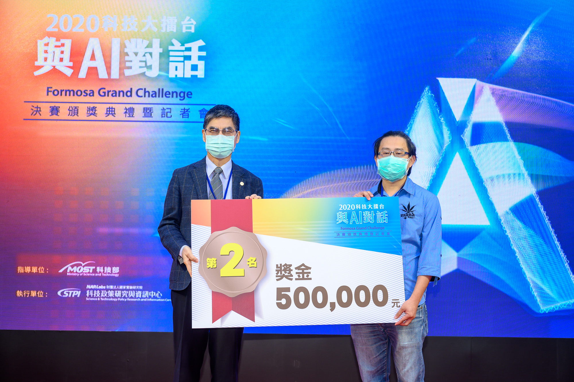 科技部部長陳良基頒獎給第2名「大叔與AI對話」團隊獎金新臺幣50萬元