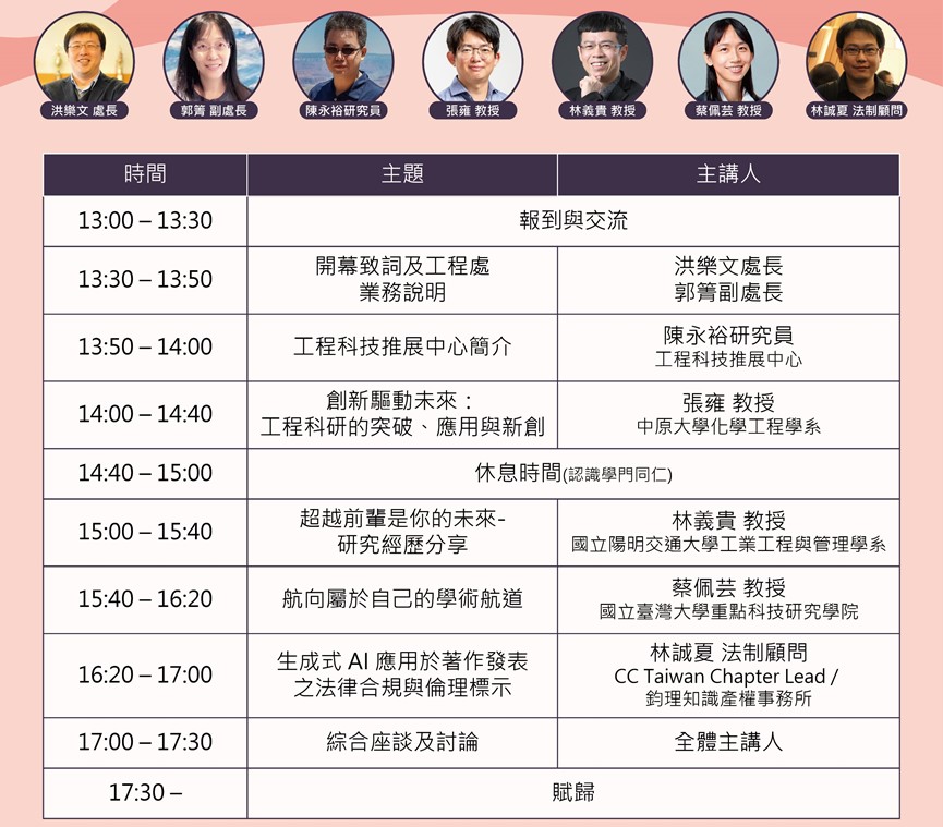 (一)為提供工程領域年輕學者一個學習成長的機會,工程處將舉辦「工程領域新進教師暨研究人員研習座談會」。國科會工程處邀請各領域之學者專家到場分享其教學研究、計畫撰寫、研究生涯規劃、及學術倫理等經驗與閱歷;藉由經驗傳承與互動交流,引領新進學者以更多元的視野展開學術研究生涯。