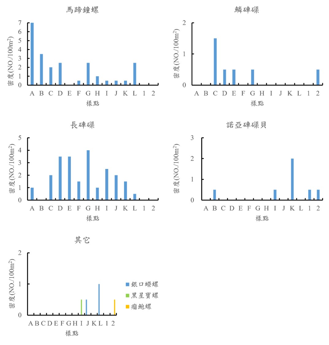 圖三、東沙環礁各測站目標螺貝類物種密度圖