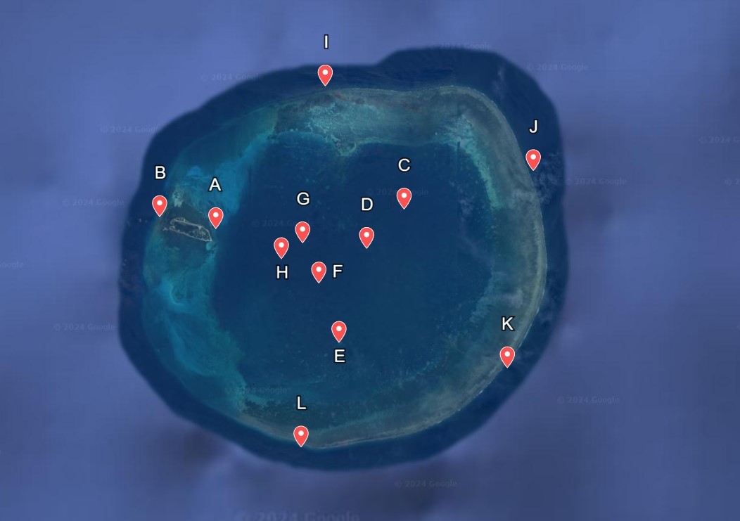 圖一、東沙環礁國家公園調查測站位置圖。(A~B:曾放流螺貝類處;C~H:環礁內測站;I~L:環礁外測站。圖片來源: Google Earth)