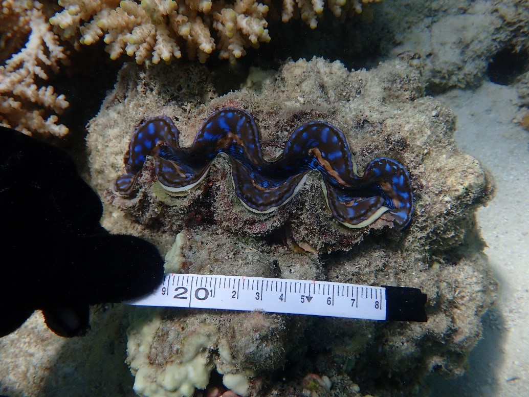 過去文獻記錄東沙環礁存在驢耳鮑、圓鮑螺、馬蹄鐘螺及硨磲貝等大型螺貝類,但多缺乏體長及族群密度等量化資料,難以進行現況比較。本研究在東沙環礁內外12個測站進行大型螺貝類調查,結果顯示除馬蹄鐘螺及硨磲貝外,其他大型螺貝類或食用種的密度普遍偏低,且菱硨磲貝、圓硨磲貝及大法螺均未被記錄到,建議透過增加調查樣點以獲得更全面的數據資料。在密度分布方面,東沙島邊的A、B測站的馬蹄鐘螺密度(3.5-7隻/100平方公尺)明顯高於其他測站(0-2.5隻/100平方公尺),可能與該區域過去的放流措施有關。比較2012年及2019年的調查數據,馬蹄鐘螺密度由每百平方公尺0-0.4及0-0.2隻,提升至2024年的0-7隻,顯示放流措施具有成效。2024年調查發現,東沙環礁所有硨磲貝物種的密度為每百平方公尺0-4.5隻,相較於2012年(0-2.6隻)、2019年(0-1隻)及2021年(0-4隻)的調查結果略有增加,顯示持續性保育工作逐漸產生效果。雖然本次調查未發現菱硨磲貝及圓硨磲貝,但在多數測站都觀察到體型較小的諾亞硨磲貝及長硨磲貝,顯示本地有硨磲貝補充群進入本海域。值得注意的是,在東沙環礁D測站發現一隻白化的鱗硨磲貝,推測本海域的硨磲貝有氣候變遷暖化及過漁的壓力。