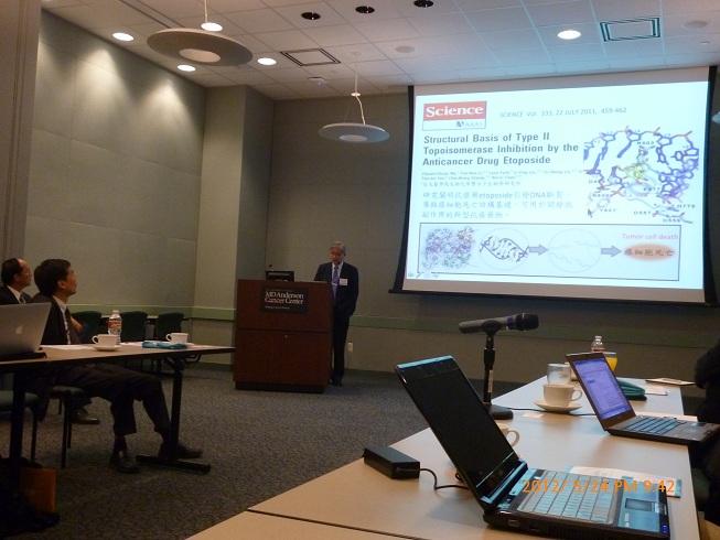 The delegations of 11 peoples formed from Taiwan International Research-Intensive Center of Excellence (I- RiCE) and National Research Program of Biopharmaceuticals (NRPB) visited MD Anderson Cancer Center (MDACC) between May 22-24. This group was led by Dean Yang, Pan-Chry who is the Primary Investigator of both mentioned programs. A welcome dinner was hosted by Director General Liao and Director Chou of Science and Technology Division of TECO in Houston. A one-day bilateral workshop was organized by Prof. Mien-Chin Hung and Prof. Ta-Jen Liu and held in MDACC on May 24. The collaborative relationship has been developed between Taiwan I-RiCE program and MDACC and this is one of the activities that are co-organized by both parties. Researchers of both sides presented their latest research work and findings during the sessions. At the meantime, the common interests were brought up and the future collaborative topics were identified. In addition to the workshop, delegations paid a visit to MDACC Proton Therapy Center. Through this visit, delegations received the first hand information about the technical operation, patient treatment, and administrative management of this center. A similar center will be established in the I-RiCE in the near future. A welcome dinner was hosted by Director General Liao and Director Chou of Science and Technology Division of TECO in Houston.