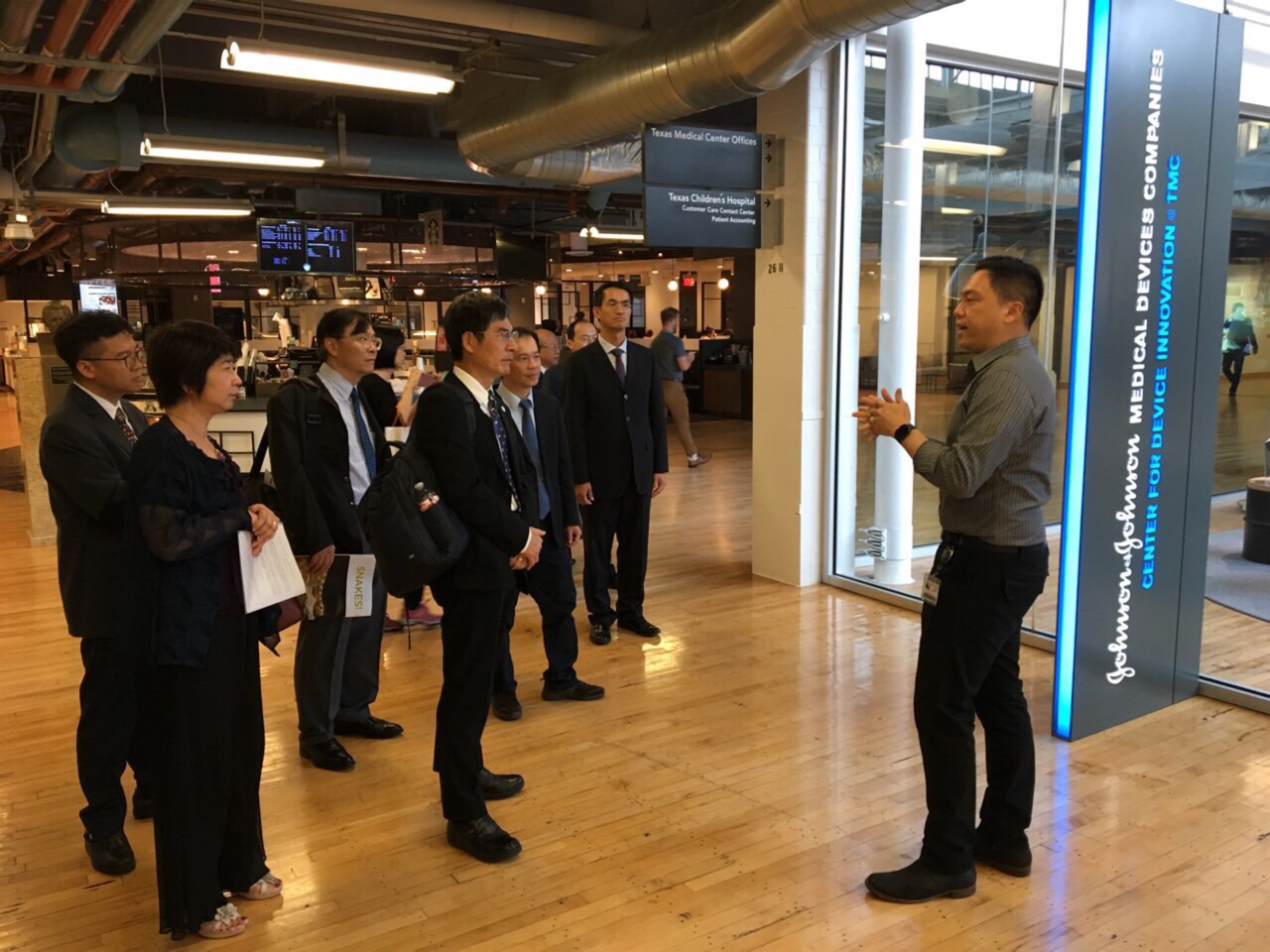 訪團接著前往德州醫學中心新創中心之TMCx和德州醫學中心美國嬌生創新育成中心(JLABS@TMC),由新創策畫Albert Huang博士接待參訪。TMCx為新創公司加速器,運用德州醫學中心醫療體系的諮詢服務,提供各種課程,透過研討會和演講,指導新創公司改進並確定市場方向,以獲得投資人注意。JLABS@TMC發展的領域涵蓋醫材、製藥與健康產品,提供創業團隊所需要的資源,例教育訓練、資金、管理、行銷等,以協助新創團隊的發展。於此次拜會中,陳良基部長強調推動臺灣的醫療研發能力的重要性,並冀望日後能與TMCx及JLABS@TMC有合作的機會。