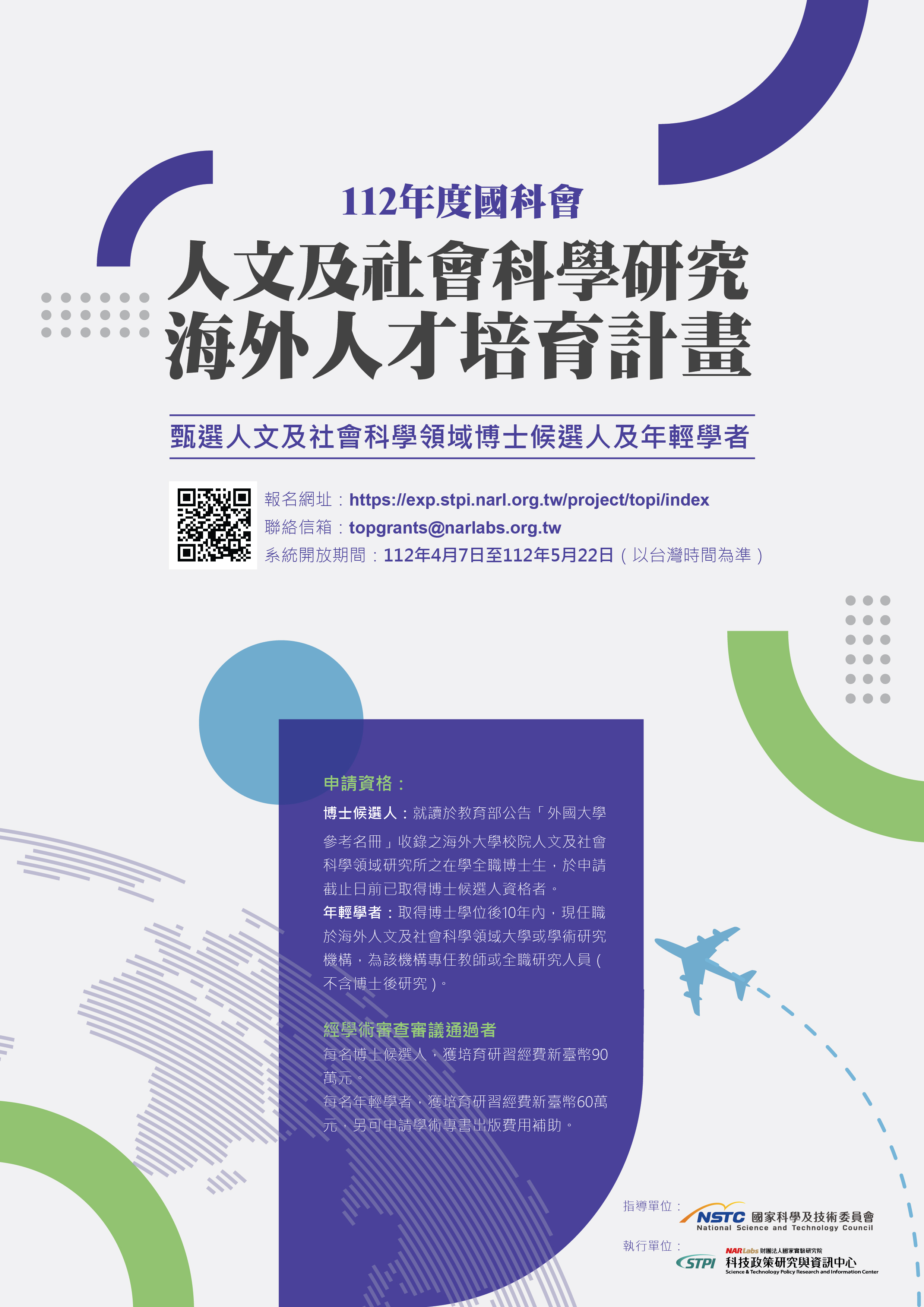 112年度國科會補助人文及社會科學研究海外人才培育計畫(Taiwanese Overseas Pioneers Grants;簡稱TOP Grants),旨為鼓勵我國在海外留學或任教之人文及社會科學領域學術人才,協助其專注於論文或專書之撰寫,以提升研究品質,並於國外知名大學或學術研究機構取得一席之地。除奠定職涯初期學者在國際學界立足之基礎,更可強化並鞏固我國在國際學術界之地位。