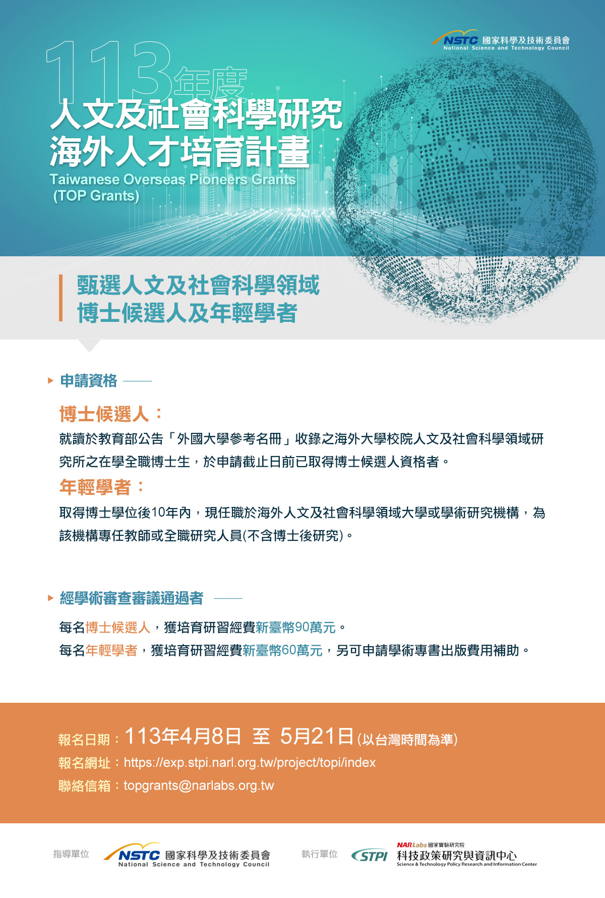 國家科學及技術委員會於2024年推動「人文及社會科學研究海外人才培育計畫(TOPGrants)」,旨在培育及支持目前在海外就學或工作的人文及社會科學領域優秀博士候選人 及年輕學者。