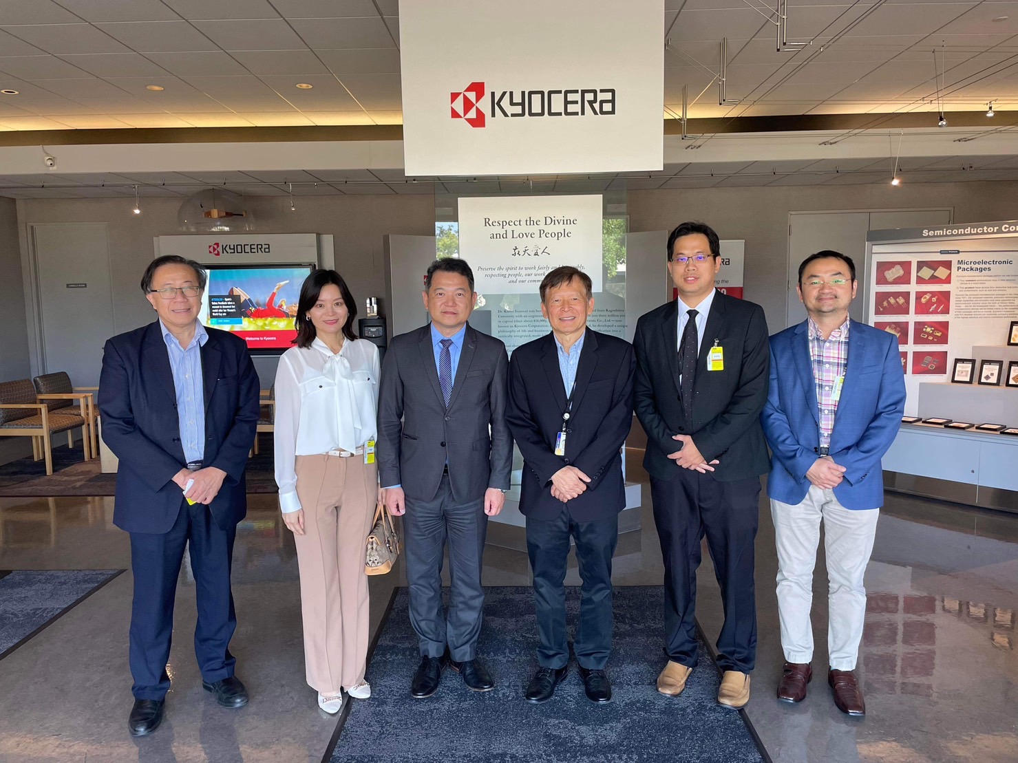 圖: 紀欽耀處長夫婦在科技組陳嘉元組長(右二) 、經濟組劉倫正組長(左一)與台灣書院簡德源主任(右一)陪同下參訪Kyocera International,由該公司技術長台裔科技人王俊明博士(右三)接待,雙方針對台美半導體產業從上游IC設計、晶圓製造到下游陶瓷封裝進行深入討論。