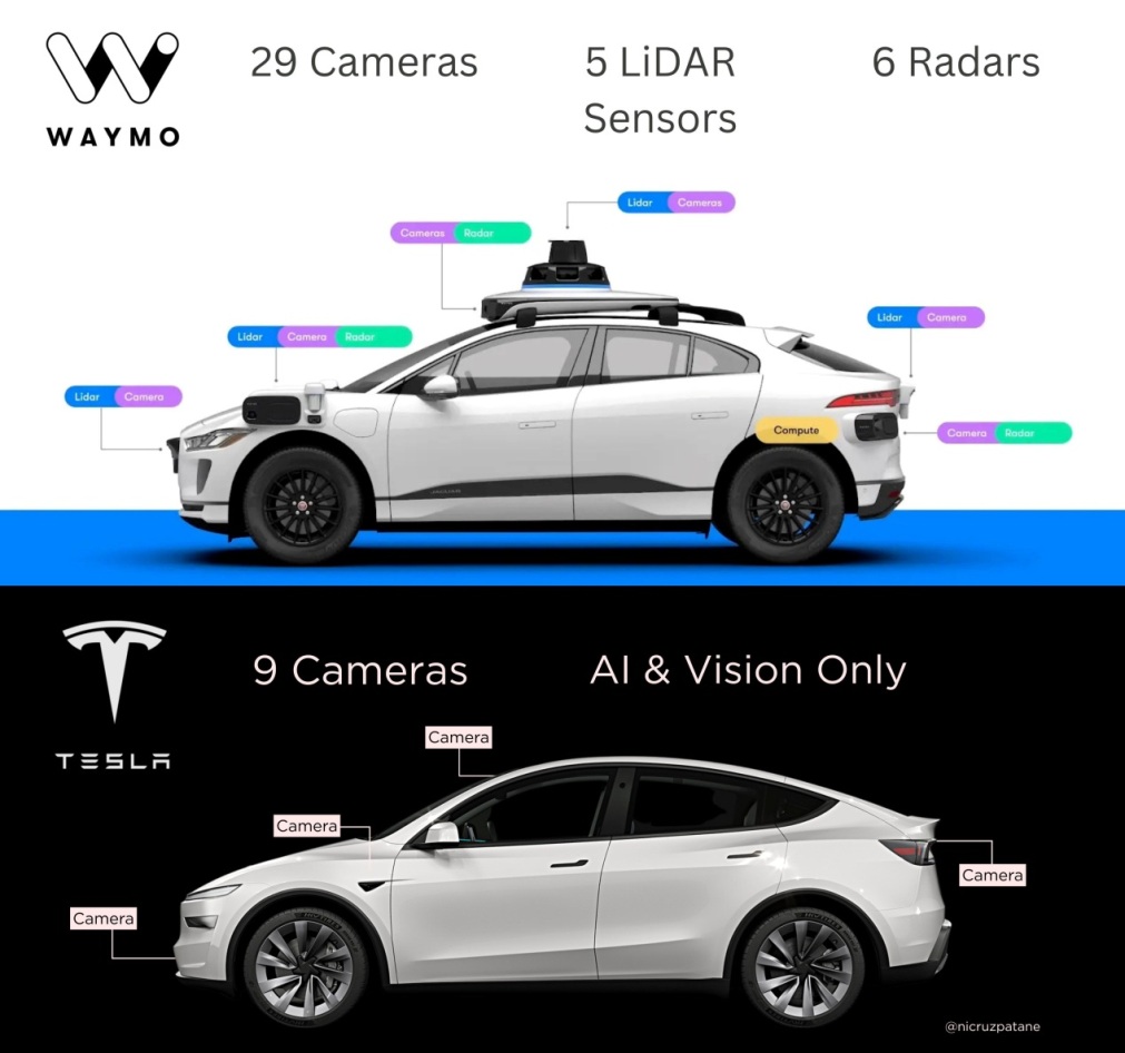 ↑圖說:目前已在街上服務中的Waymo (One Jaguar I-PACE with the 5th-gen Driver)自駕車與特斯拉電動車的核心技術比較圖