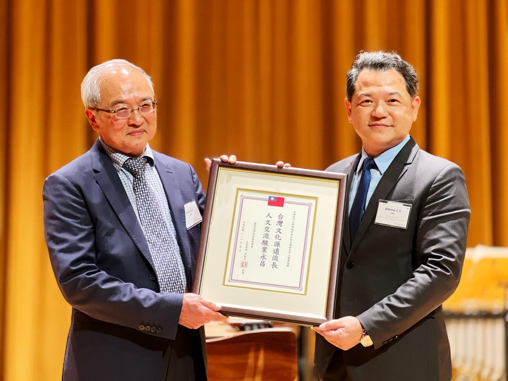 圖1:駐洛杉磯科技組陳嘉元組長安排駐洛杉磯台北經濟文化辦事處紀欽耀處長(右一)代行政院政務委員兼國科會主委吳政忠博士致贈賀狀予UCSD台灣研究中心主任廖炳惠教授(左一)。