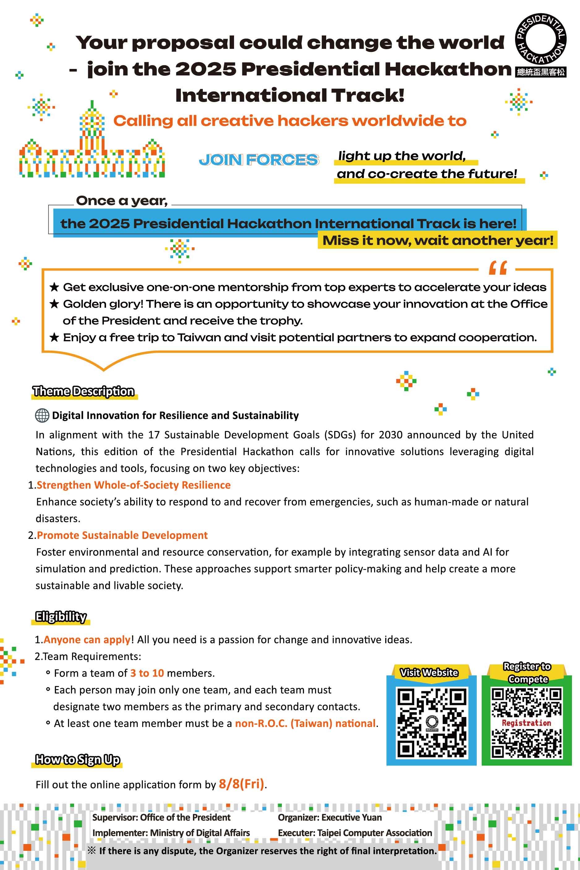 In alignment with the 17 Sustainable Development Goals (SDGs) for 2030 announced by the United Nations, this edition of the Presidential Hackathon calls for innovative solutions leveraging digital technologies and tools, focusing on 1) strengthen whole-of-society resiliance and 2) promote sustainable development