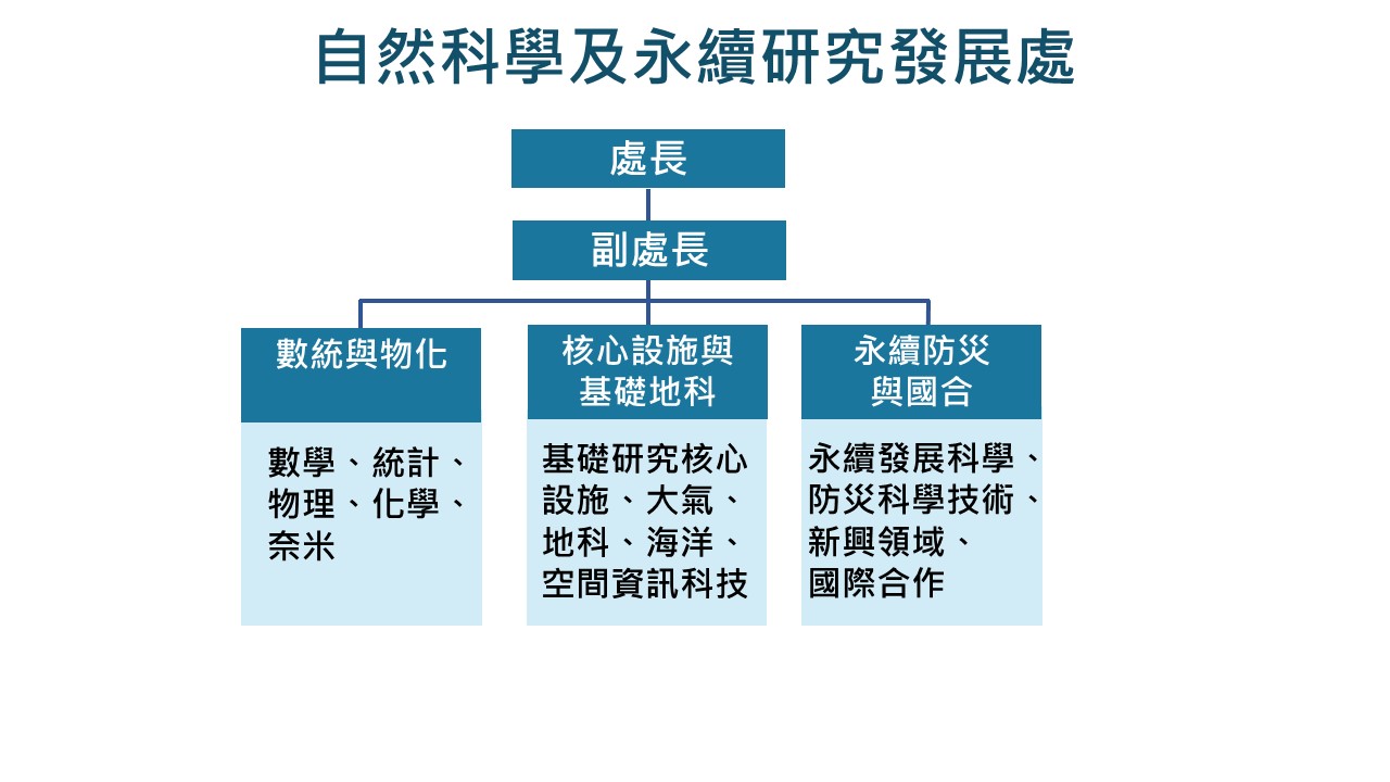 自然科學及永續研究發展處設有處長、副處長,其下設有數學、化學與物理科(第一科)、基礎研究核心設施、大氣、地科、空間與海洋科(第二科)及永續防災科(第三科)等3個科。